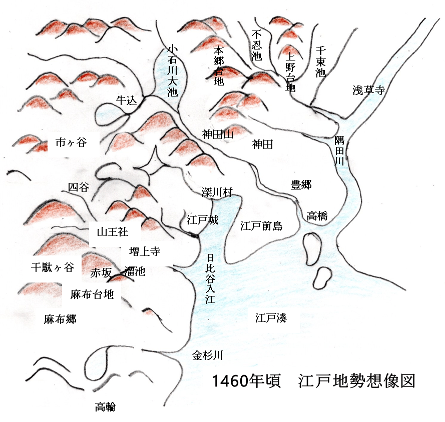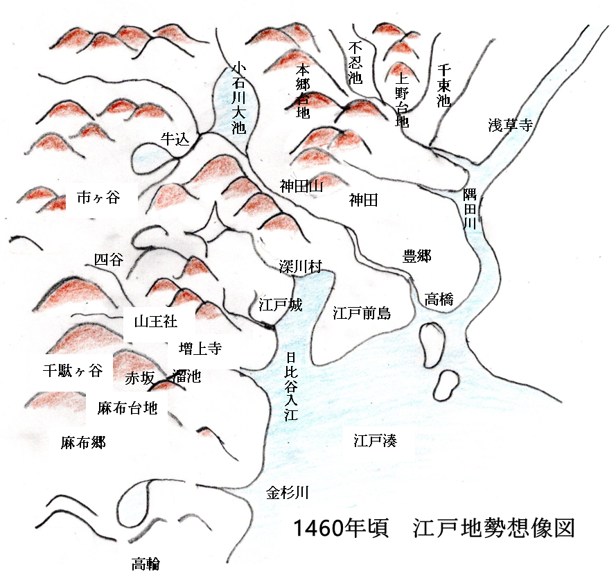 時代は少し遡り関東は享徳の乱(きょうとくのらん:1455ー1483)と呼ぶ戦国時代でした。関東管領を代々務める上杉氏に不満を持つ関東周辺の領主の支持を集め「古河公方」と名乗る足利茂氏と断続的に戦が続いていました。 下総古河城を拠点とする足利茂氏側であった下総の武将千葉氏への備えとして太田道灌は江戸を選びました。当時江戸の西部と北部は台地で生活水が乏しくて人家が無く、台地の淵に農家が少し、江戸湊の漁村がある土地で、背面は広大な大地で葦やススキの生い茂る原野でした。