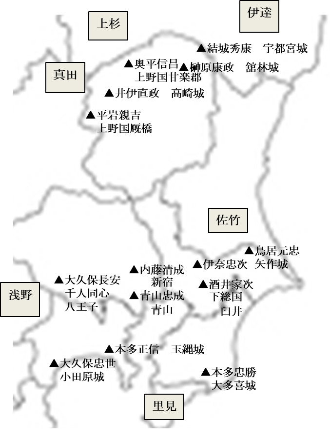 知行割は権力の空白化をさけるため領地支配の最優先事項で、移封後直ちに家臣が配置されました。有力大名に通じる街道沿いの要衝には重臣を、江戸周辺には旗本・譜代の家臣を配置しています。