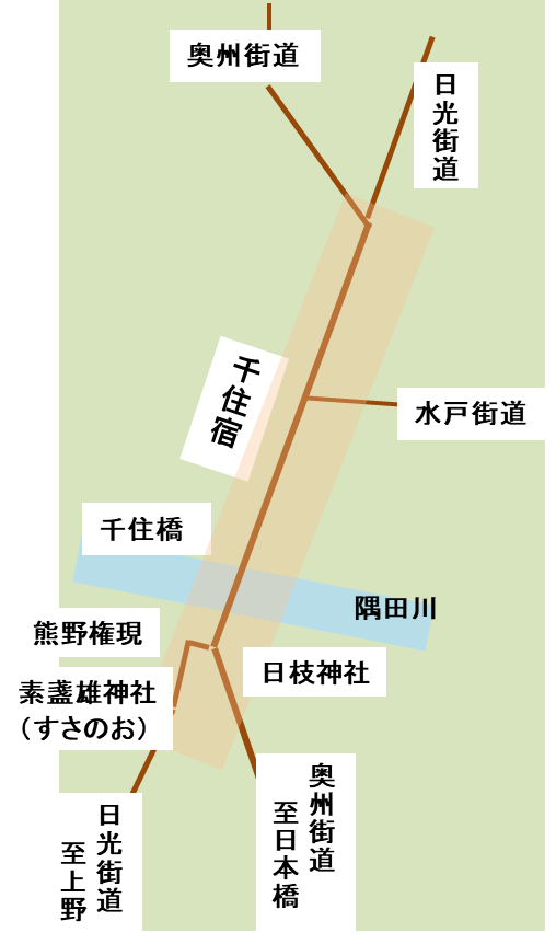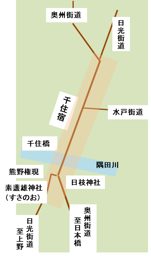千住宿は千住大橋が架橋されると奥州街道・日光街道の駅馬を継ぐ宿として 指定され発展しました。上野方面からくる日光街道と浅草方面からくる奥州街道を合わせ、宿の中で水戸街道が分かれ橋を渡ると日光街道と奥州街道に分かれる街道の集散地となっているのが千住宿の特徴です。水路と陸路が交わる交通と物流の要衝地となり、多くの人と物が集まるようになり、商業が発展しました。