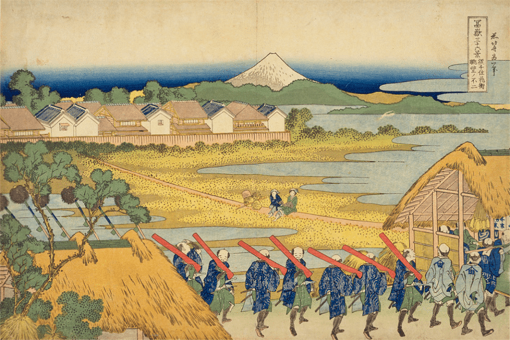 千住宿を大名行列の鉄砲隊後ろに槍隊が通過中です。遠くに花街の建物と富士山がみえます。絵の中央に農家の女性二人が稲刈りの終わった田圃の畦道に座りながら行列を眺めています。先頭の武士も気になって二人の方を見ながら道中の励みとなっています。
