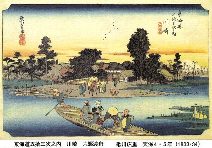 長さ107間 (194.5m)、幅4間1尺7寸 (約8m)、高欄の高さが4尺3寸 (1.3m)の六郷橋が慶長5年(1600年)に架橋されました。 関が原の戦い(10月21日)で家康率いる東軍が六郷大橋を渡橋したとおもわれます。洪水により橋は流され何度か再架されたましが、貞享5年(1688年)の洪水以後、橋は 再架されず 六郷の渡しが設けられました。