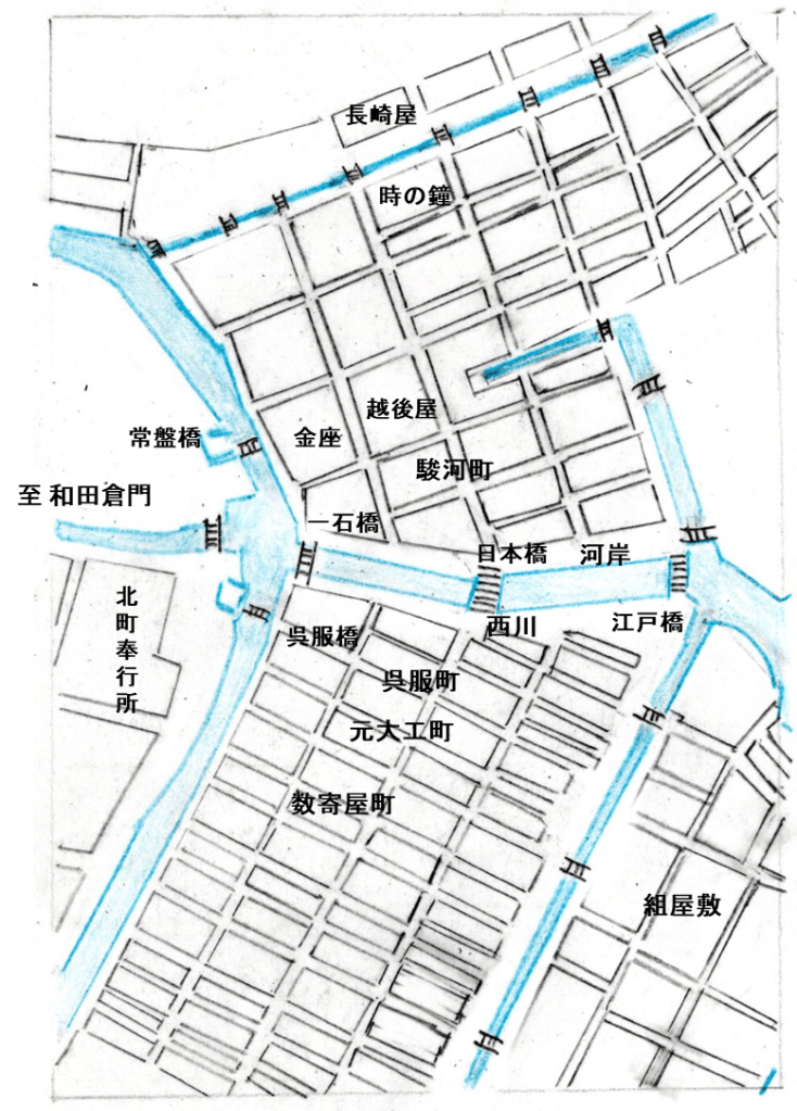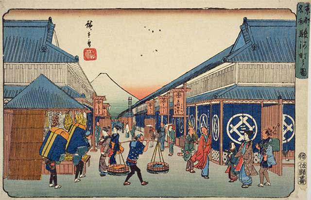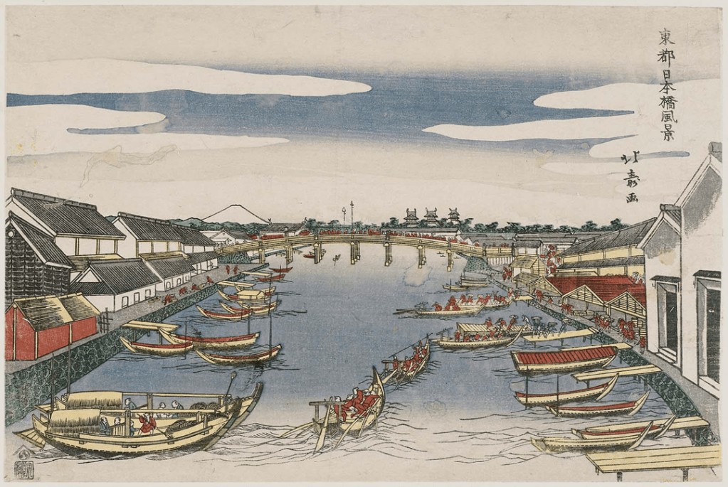 日本橋近辺は隅田川と江戸城内堀が水路で通じる水陸交通の要衝で経済・物流の拠点となりました。日本橋は中央が高いアーチ型で、富士山・江戸城天守閣を望め見晴らしが良い観光スポットでもあり、大勢の人で賑わいました。