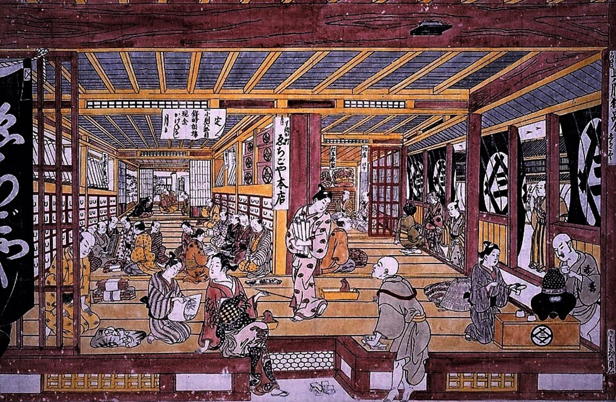 - 小さな布も販売 それまで着物1着分の布が販売単位でしたが、前掛けや小さな着物も切り売りする職人や町人等庶民をお客に増やしました。