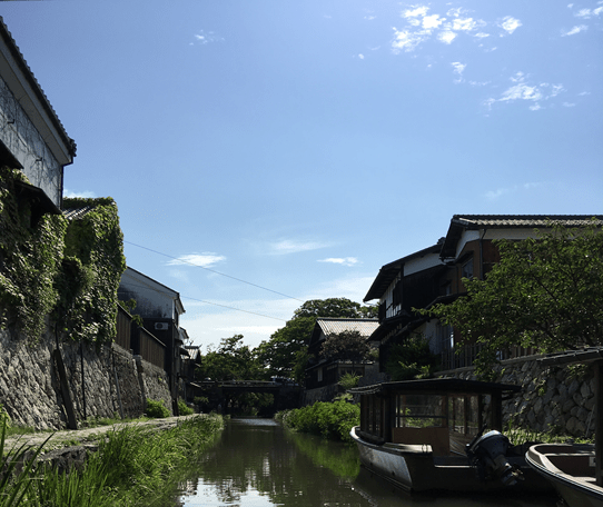 近江八幡八幡堀の写真です。前方橋の左に見えるのが西川甚五郎の蔵で、蔵から直接舟堀への石段を使って商品を積み込み、琵琶湖に出で大阪・京に運びました。近江八幡も江戸も荷の運搬は 水路を利用した舟であった事がわかります。