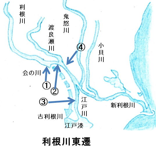 古利根川と古荒川が合体して引き起こした河川氾濫を治める方法として古利根川も流路を変える「荒川の西遷」を利根川東遷工事中におこないました。そして新利根川から江戸への水路「江戸川」を開削し舟運ルートを確保した渾身の治水工事でした。