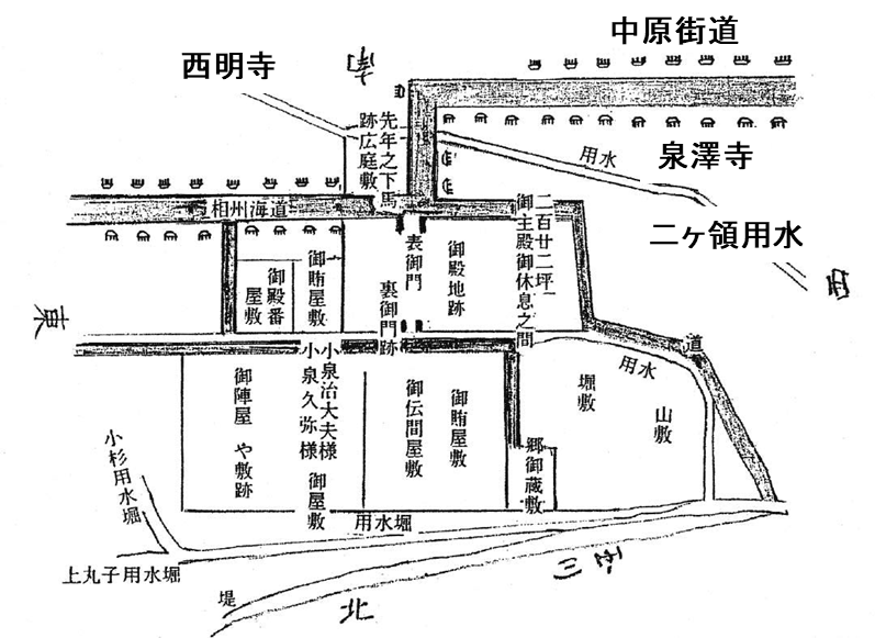 右手の奥に将軍が休む御主殿、北側の裏門、御蔵御賄屋敷、御殿番屋敷が配置され御主殿東側は小杉陣屋と次太夫代官屋敷がありました。