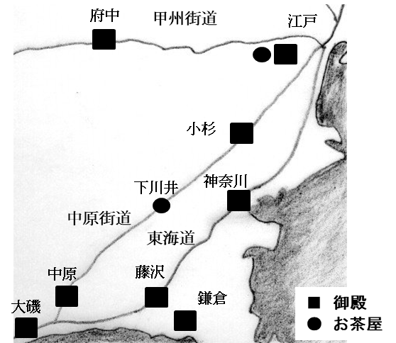 中原御殿跡と中原街道の絵図は残されています。 平塚市博物館 中原御殿 中原御林