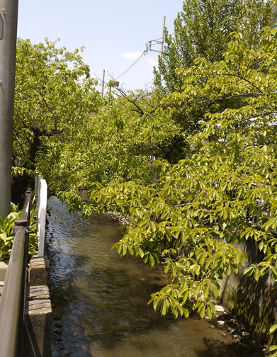 中原街道と二ヶ領用水(川崎堀)が交差する地点に架かる神地橋(ごうじばし)からの現在の二ヶ領用水です。