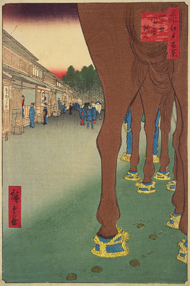 甲州街道は産業道路としての役割もあり、馬糞も目立ったようです。他の絵師も含めて、広重は新宿をこの絵以外描いていません。
