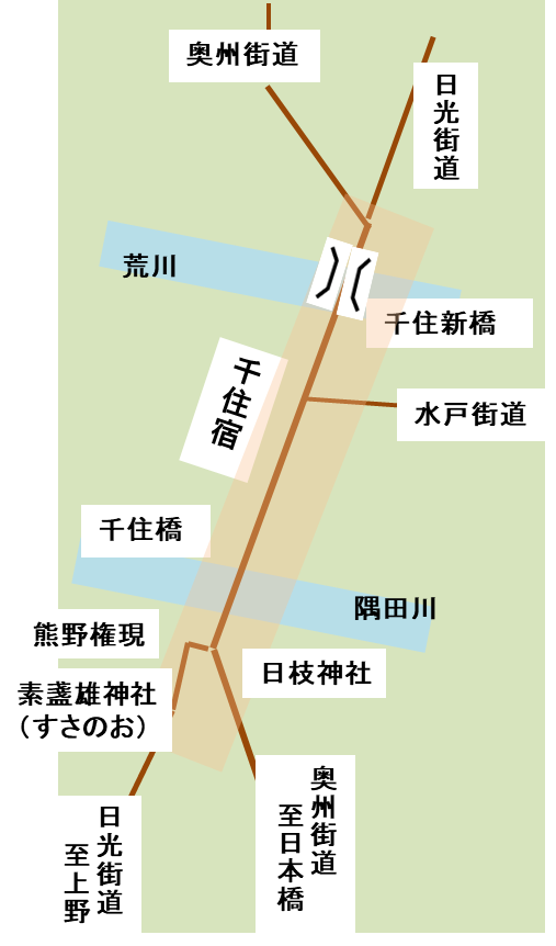 奥州街道と日光街道が合わさり、水戸街道、日光街道、奥州街道に分かれていく街道の集散地となっているのが千住宿の特徴です。